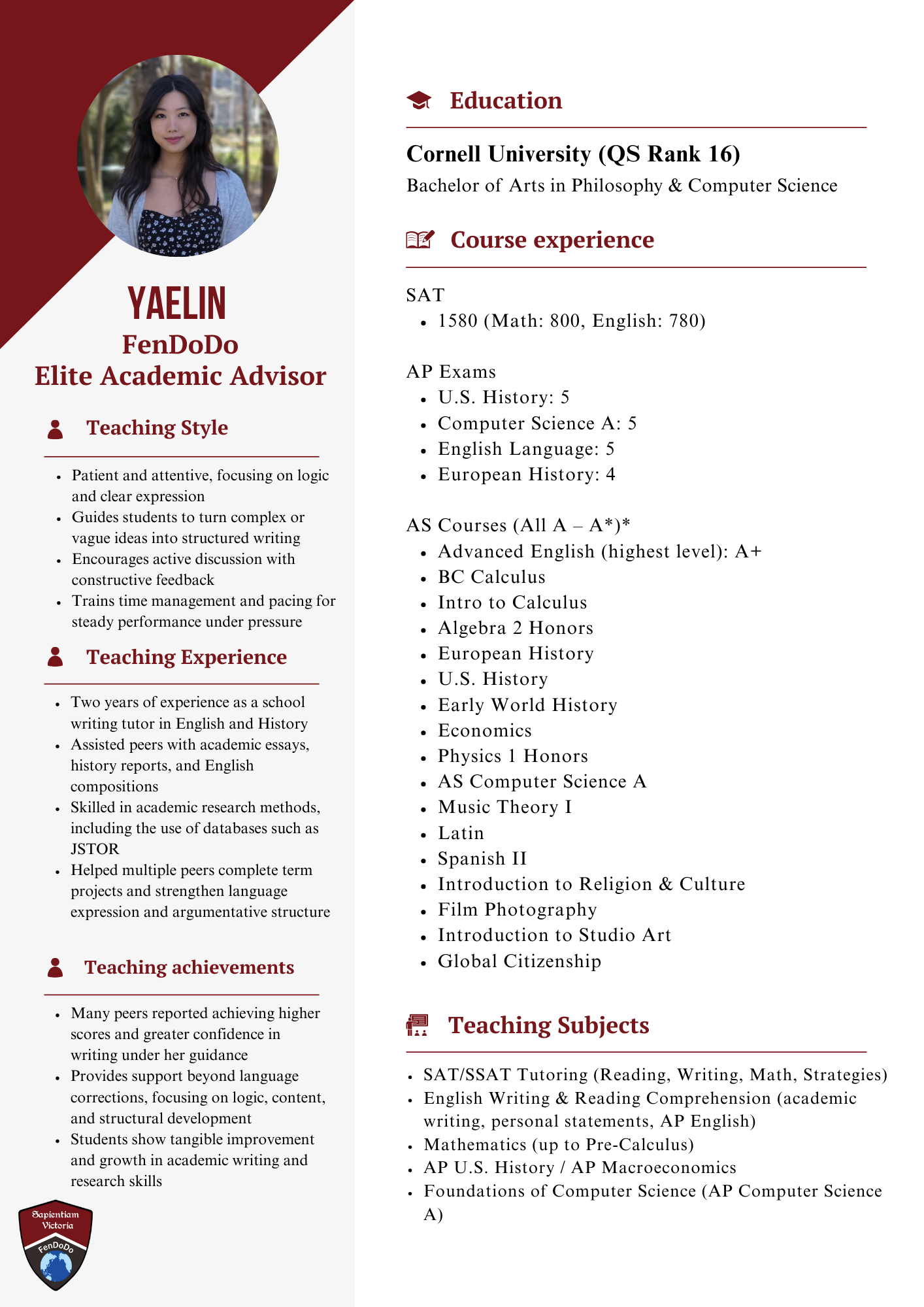 Yaelin holds a BA in Philosophy & Computer Science and is an accomplished writing mentor with two years of experience guiding peers in academic essays, historical reports, and English compositions. Her strengths lie in elevating logic, structure, and clarity through personalized feedback and robust research methods. She achieved near-perfect scores (SAT 1580; AP US History, Computer Science A, and English Language all 5), and consistently helps students boost grades and confidence in writing, reading, and personal statement crafting.