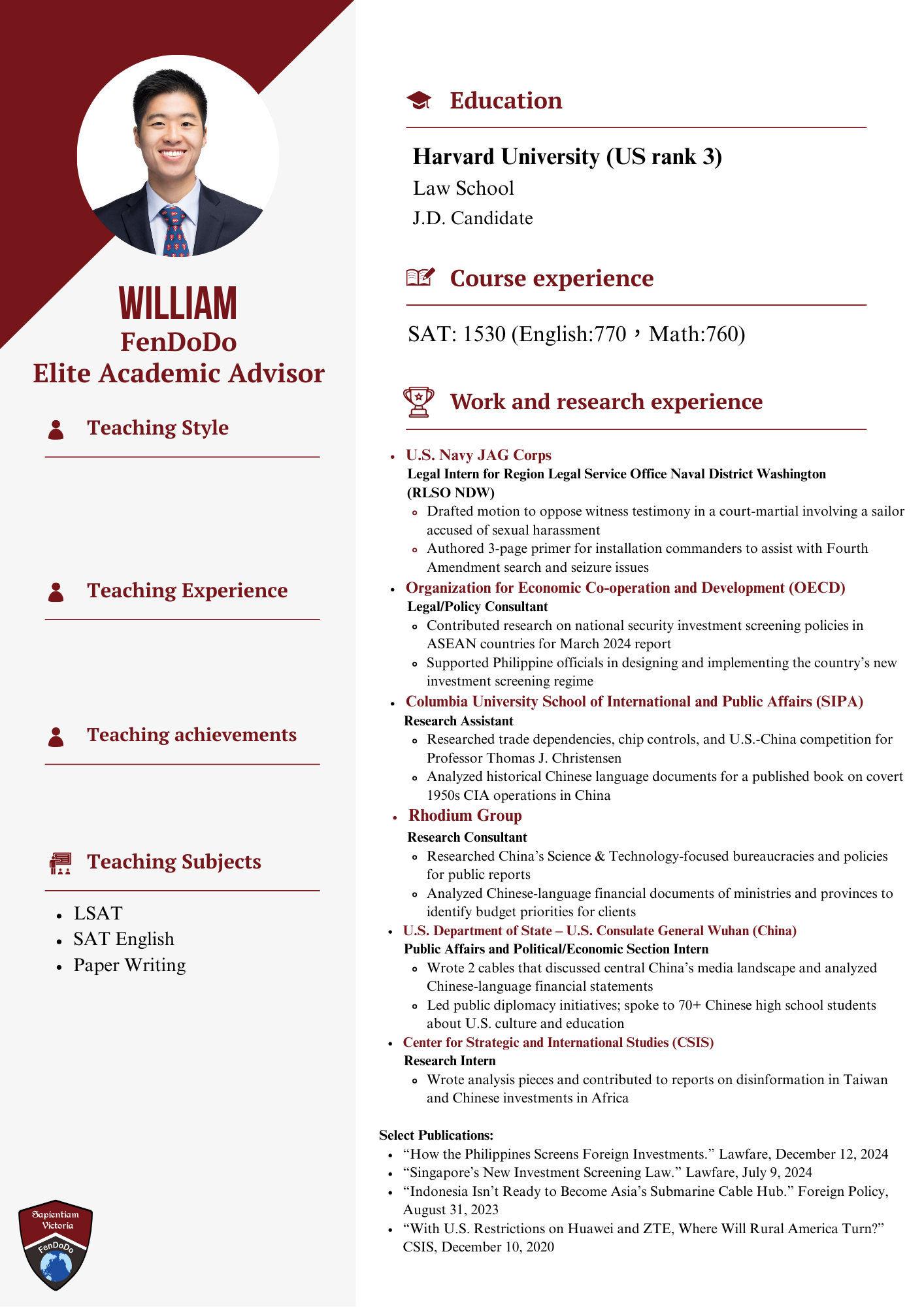 William is a top-tier tutor and current Harvard Law student with a 1530 SAT (770 English, 760 Math) and extensive experience in legal writing, international research, and public policy. With a background spanning the U.S. Navy JAG Corps, OECD, Rhodium Group, and Columbia SIPA, William offers students expert guidance in LSAT prep, SAT English, and academic writing. His teaching is analytical, structured, and engaging—ideal for students seeking to strengthen their logic, reading, and writing skills with support from someone who’s excelled at the highest academic levels.